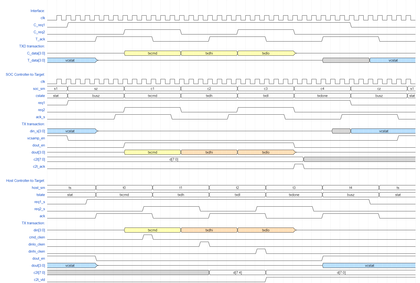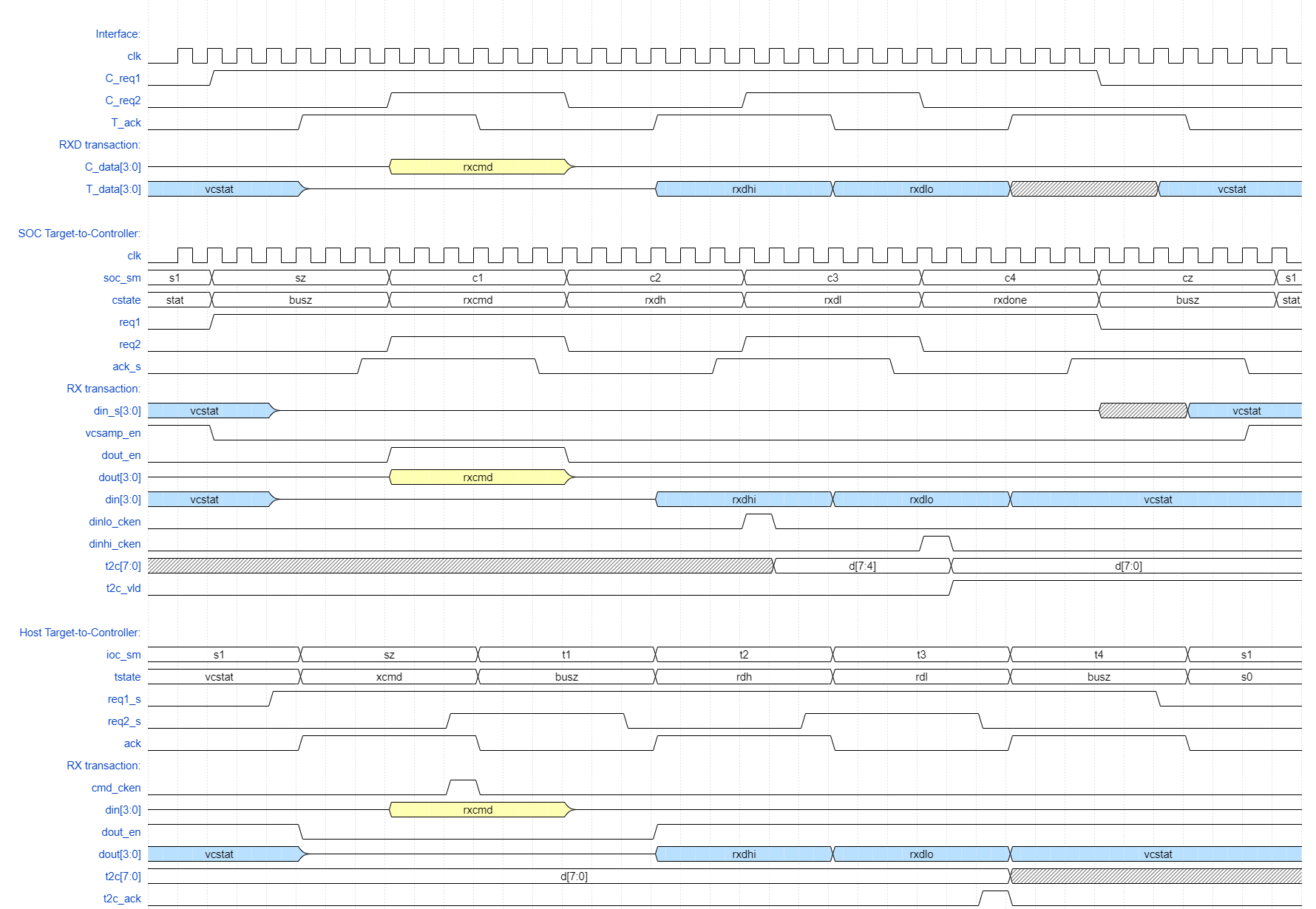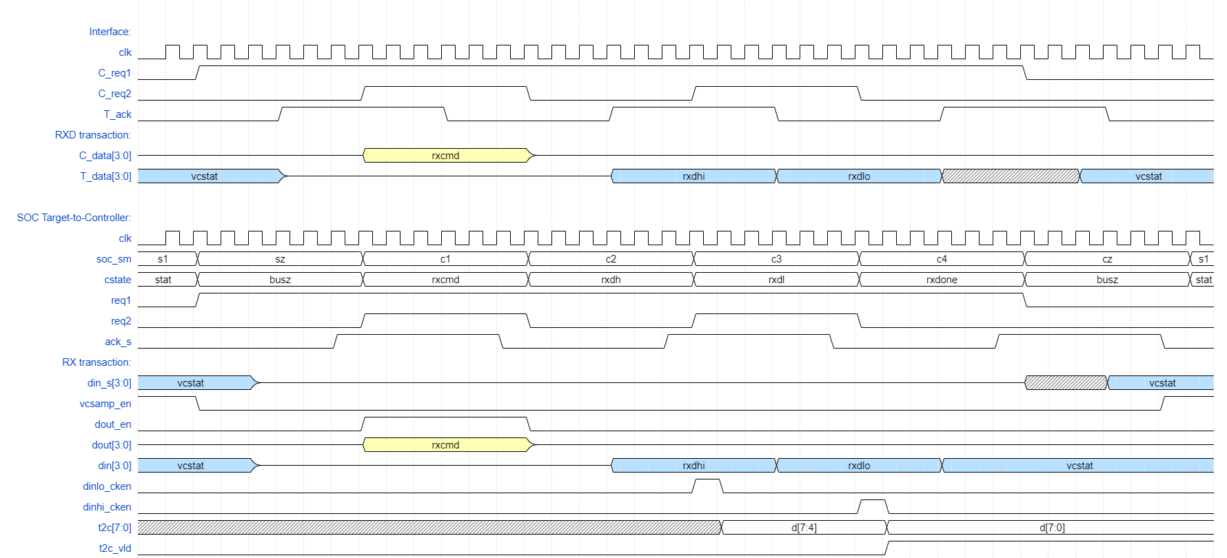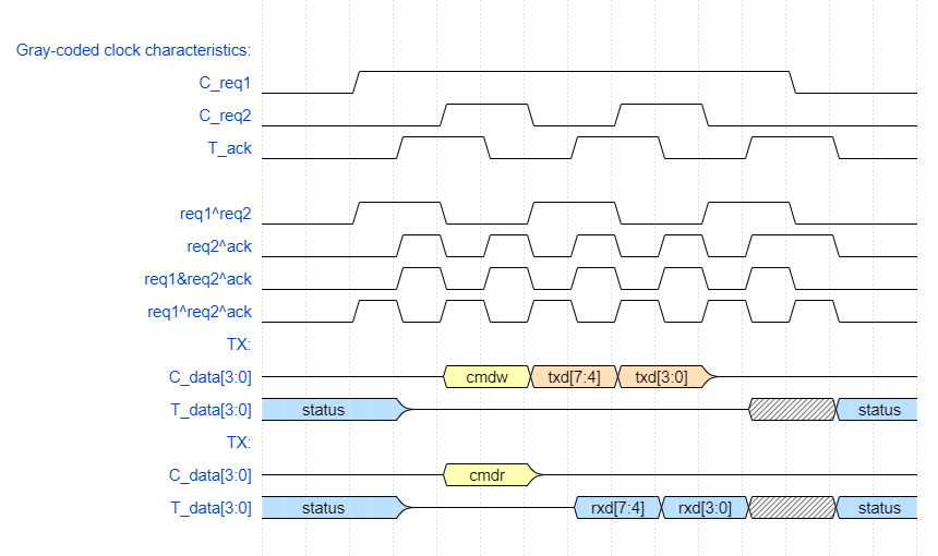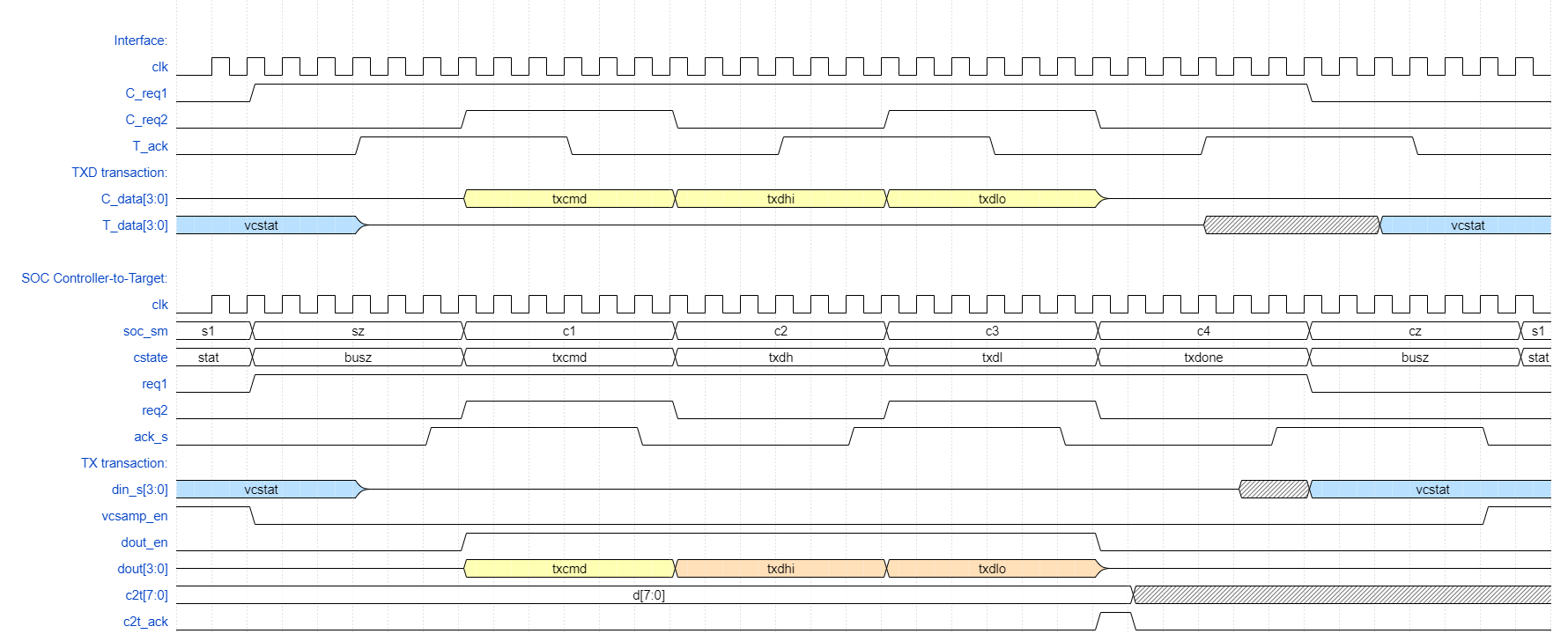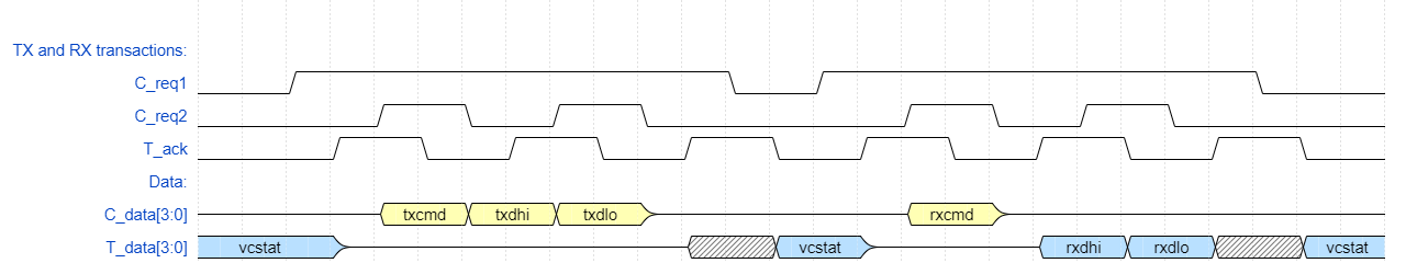 Each change of Request signalling transition results in the Acknowledge toggling (synchronized "_s" version seen at the SoC) only when the bidirectional data bus is enabled, sampled, or disabled as appropriate.